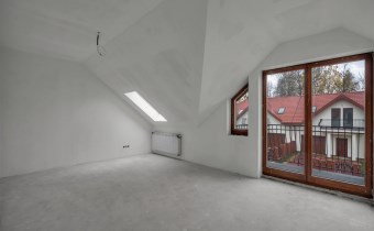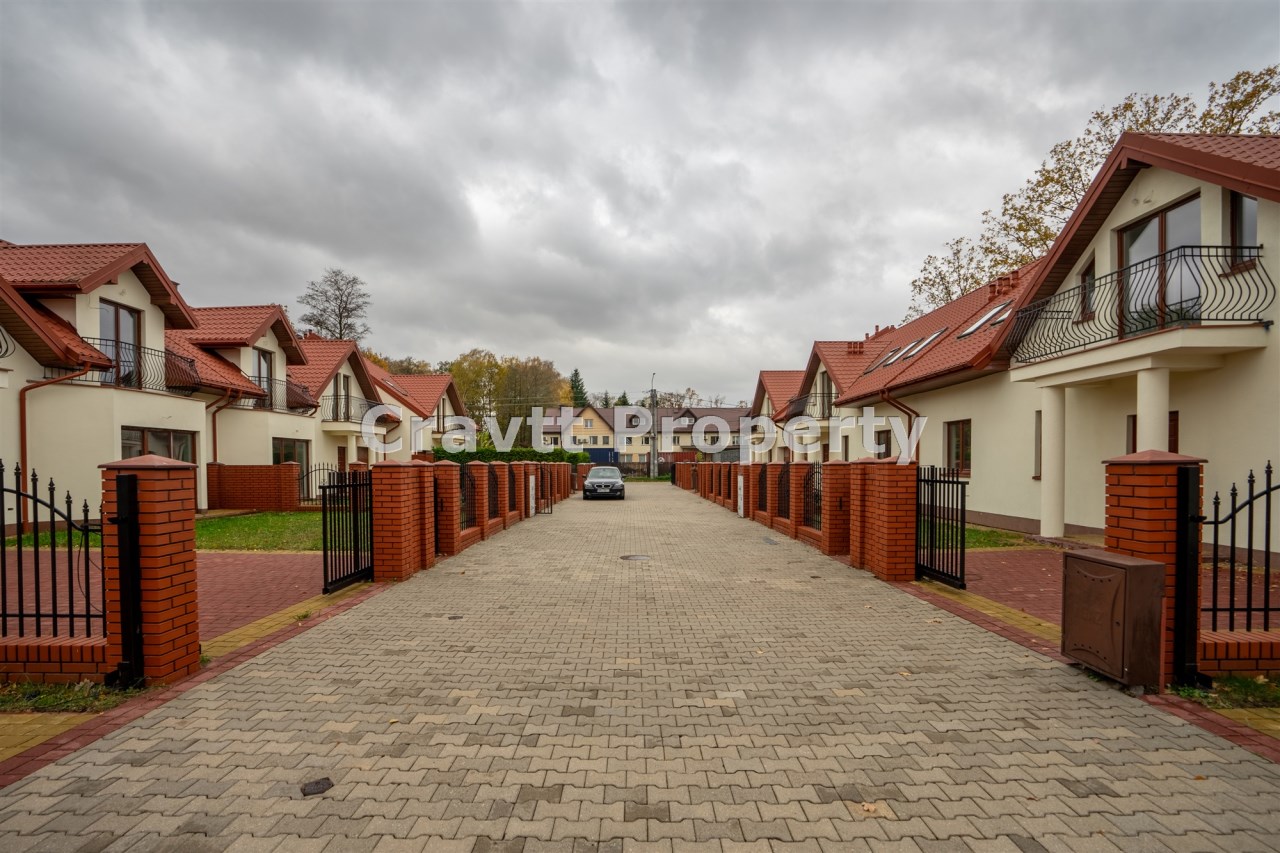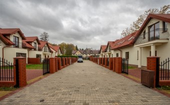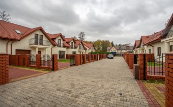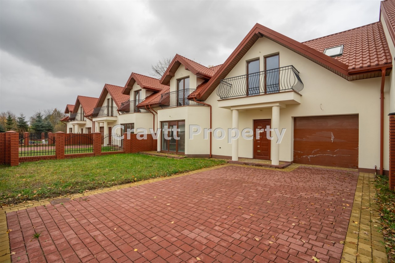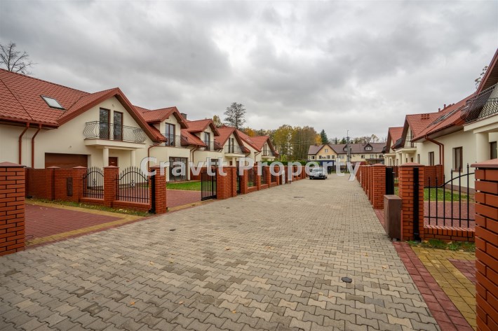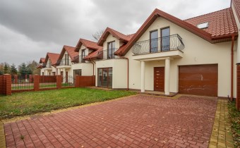 Dom wykończony w standardzie deweloperskim z garażem w bryle budynku. Elewacja w jasnych kremowych kolorach, klinkierowe kominy, pokrycie dachówką w kolorze brązowym, podobnie jak wszystkie obróbki blacharskie/orynnowanie. Kute, metalowe balustrady balkonów. Tarasy z kostki brukowej w kolorze brązowym. Wszystkie media miejskie(woda, prąd, kanalizacja,gaz). Ogrzewanie - piec gazowy.