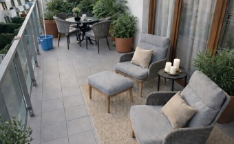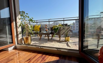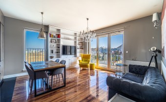 - przestronnego salonu z aneksem kuchennym i wyjściem na balkon (12 m², szklana balustrada),