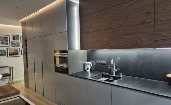 Wnętrze wykończone w wysokim standardzie z użyciem materiałów bardzo dobrej jakości: meble na wymiar, pełne wyposażenie AGD Siemens.